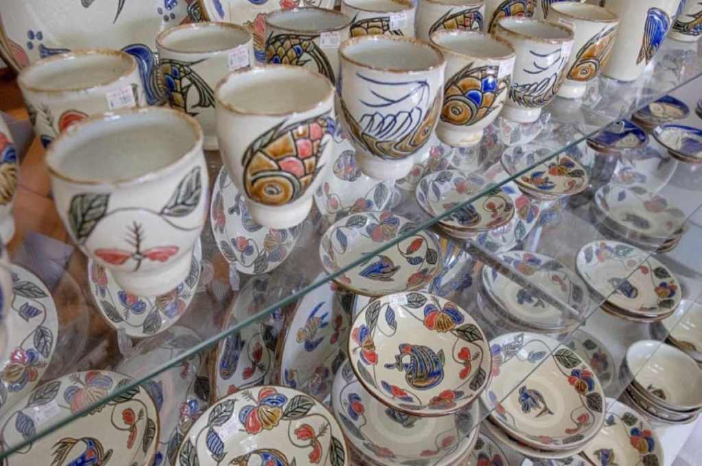 I purchased a 5-inch plate (3,300 yen each) with paintings of sea turtles, fish, and whales on the bottom shelf by Jiro Kinjo’s granddaughter, Kanako Fujioka.