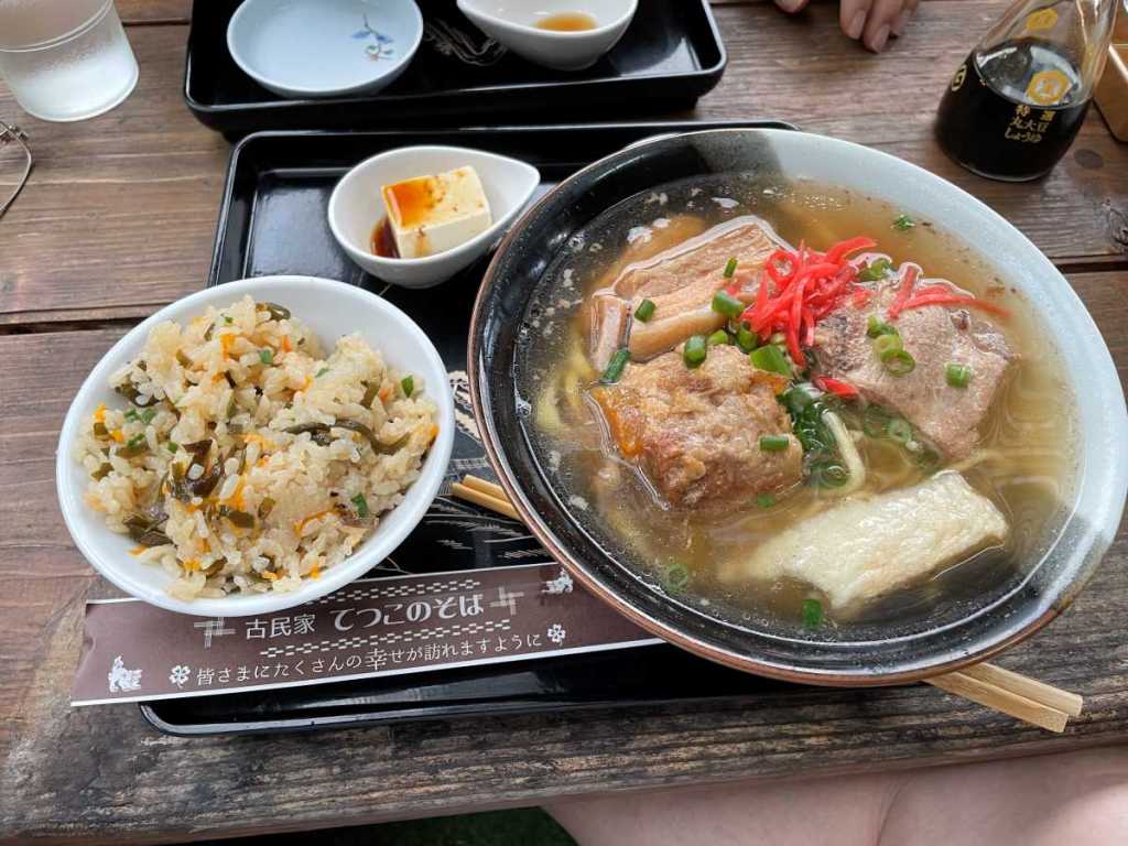 After exploring the Nakijin Castle ruins, we made our way to the Churaumi Aquarium. Around midday, I stopped by KominKa Tetsuko Soba and enjoyed a mixed Okinawa soba with pork spare ribs, three-piece pork meat, and pork cartilage, accompanied by juicy rice.