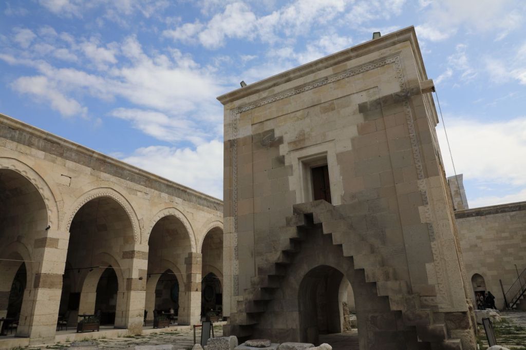 Today, we departed from the hotel at 8:30 am and embarked on a journey from Cappadocia to Pamukkale, tracing the route of the ancient Silk Road. The journey spans approximately 600km, roughly equivalent to the distance from Tokyo to Himeji. After covering about 250km, we took a break at the Sultanhani Caravanserai, a historical caravan lodge.