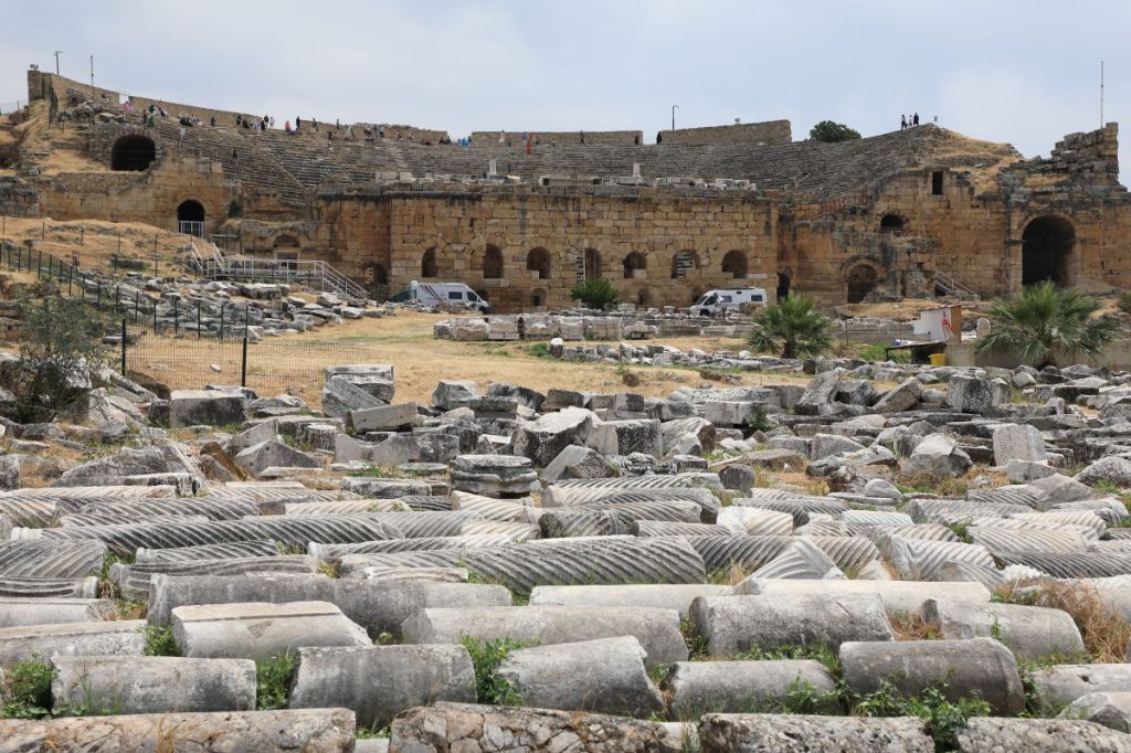 In front of the amphitheater, parts of a structure are currently under excavation.