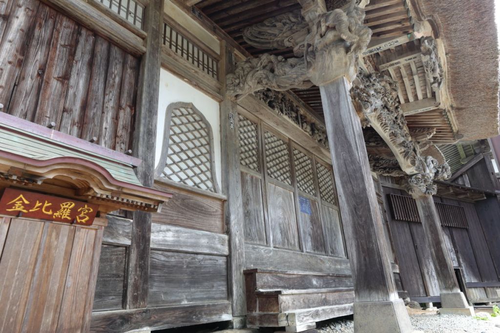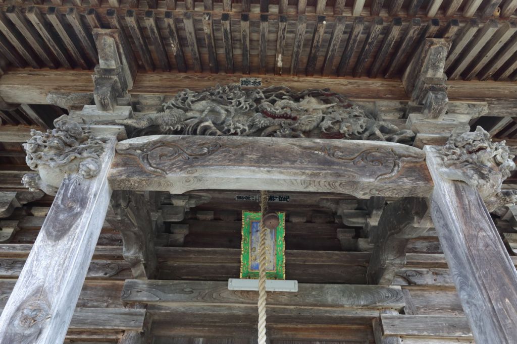 拝殿前には龍の彫刻と両脇の獅子が力強く彫られています。