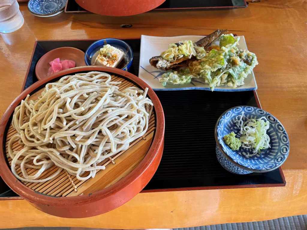 昼食は大内宿でネギそばという選択もありましたが、今回は塔のへつりへの入り口の五晃苑というそば屋にしました。太打ちの手打ちそばでイワナの揚げ焼と野菜の天ぷらが付いたへつりそばを注文、イワナは頭から骨まで食べられました。