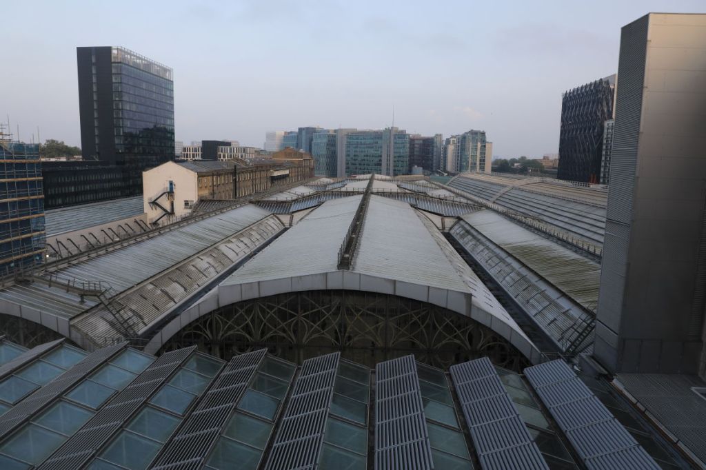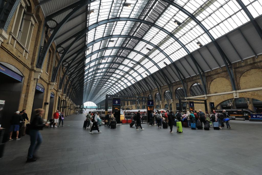 St. Pancras Station, located to the left of this station, opened in 1868 as the terminal for the Midland Railway and is a stunning example of Victorian neo-Gothic architecture. It now serves as the terminal for Eurostar services.