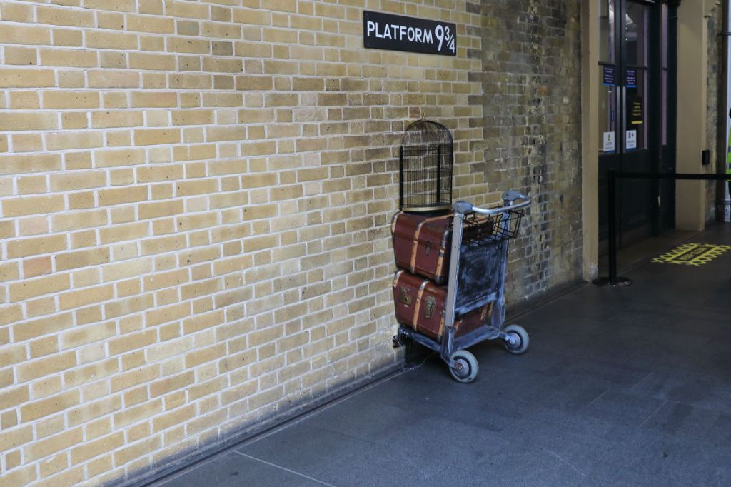 Platform 9-3/4 is situated at the rear of the station’s platform, complete with a Harry Potter shop that often has a line of tourists waiting out front.