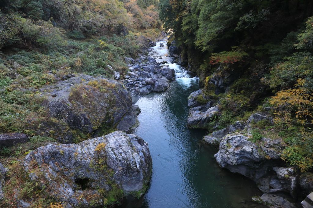 ここでそば定食(もりそば、刺身こんにゃく、山菜の盛り合わせ)を食べてから鳩ノ巣渓谷に向かいました。あいにくここでの紅葉はまだ色づき始めというところでした。