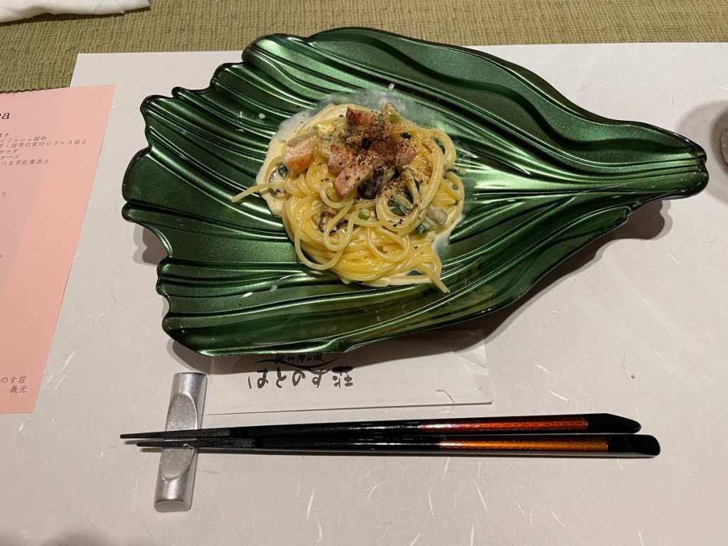 二皿目はプリモ・ビアットとしてベーコンと茸のカルボナーラスパゲティ。