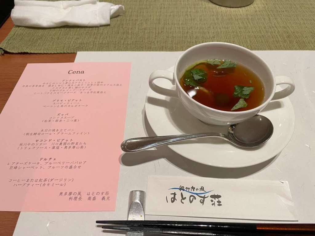 三皿目はズッパとして松茸、銀杏、三つ葉の入ったコンソメスープで、具の素材を和風にした遊び心があるスープです。松茸の香りもほのかに漂い美味です。