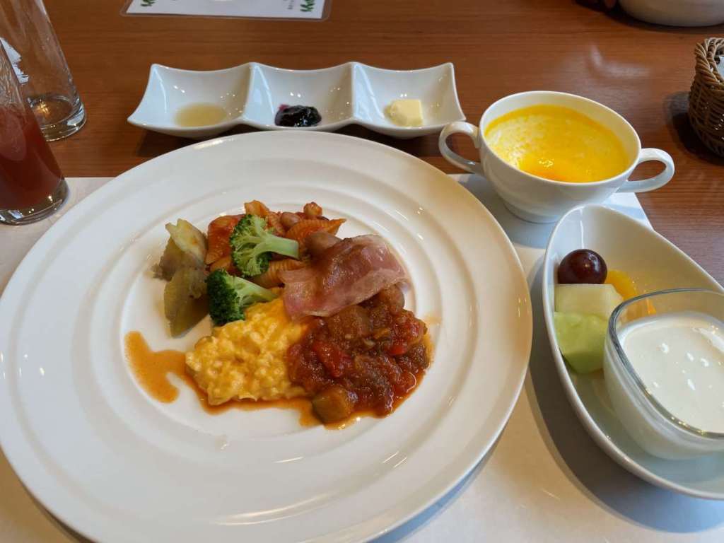 翌朝は昨日の好天から打って変り、あいにくの雨模様、朝食後もチェックアウトまでゆっくり宿で過ごすことにしました。朝食もブッフェではなく一皿に朝定番の料理が並んでいました。