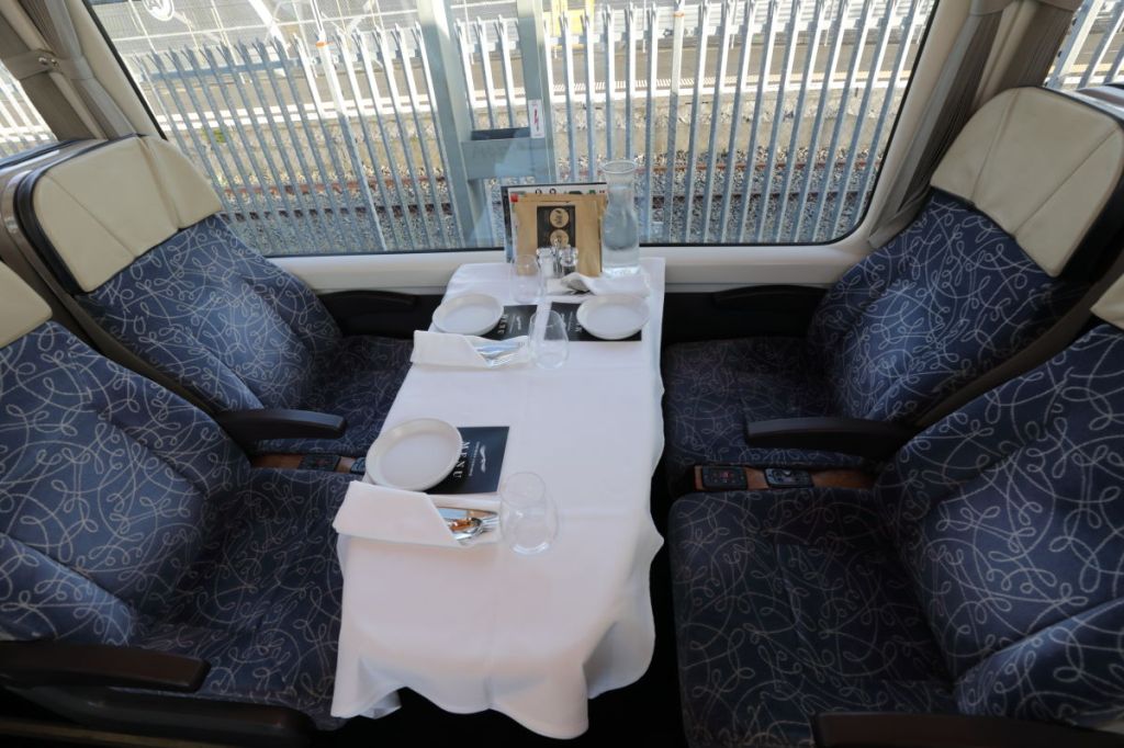 The seating arrangement and view were the same as in a regular car, but there was a sheet on the table and water was provided.