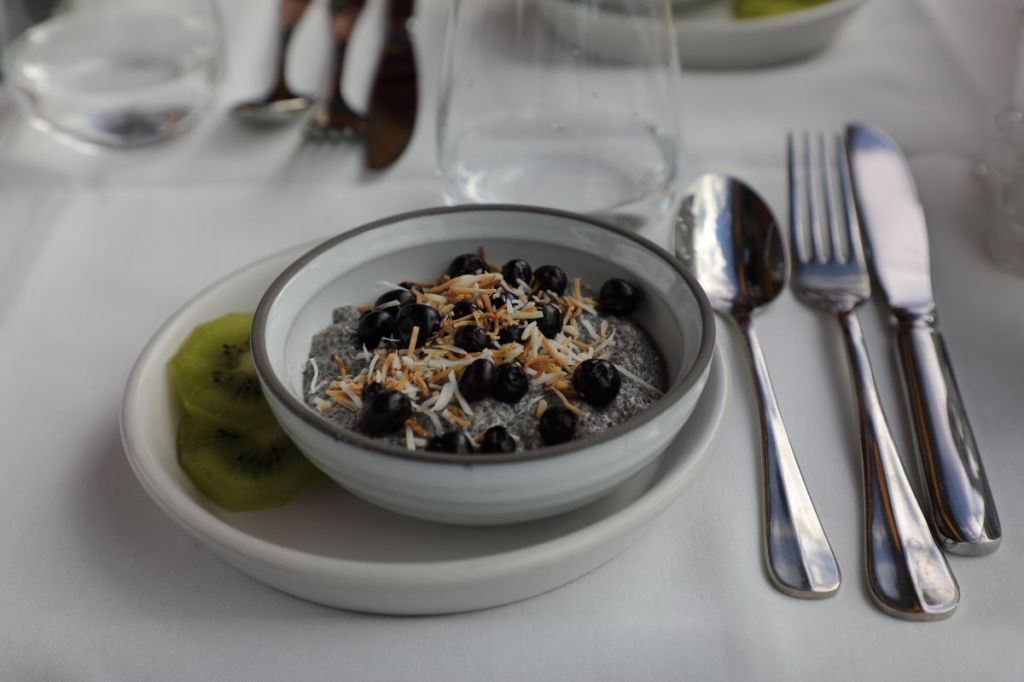 Following that was the Cold Breakfast, consisting of a vanilla chia pudding adorned with blueberries and coconut threads, and garnished with classic kiwi slices. Chia seeds are a nutritious food.