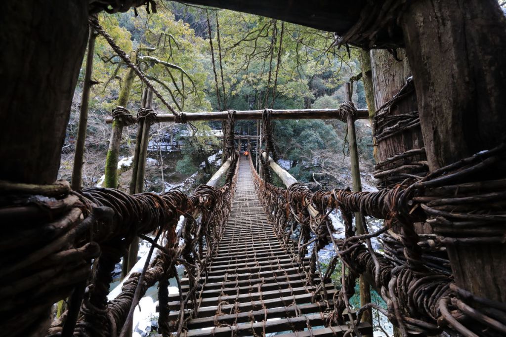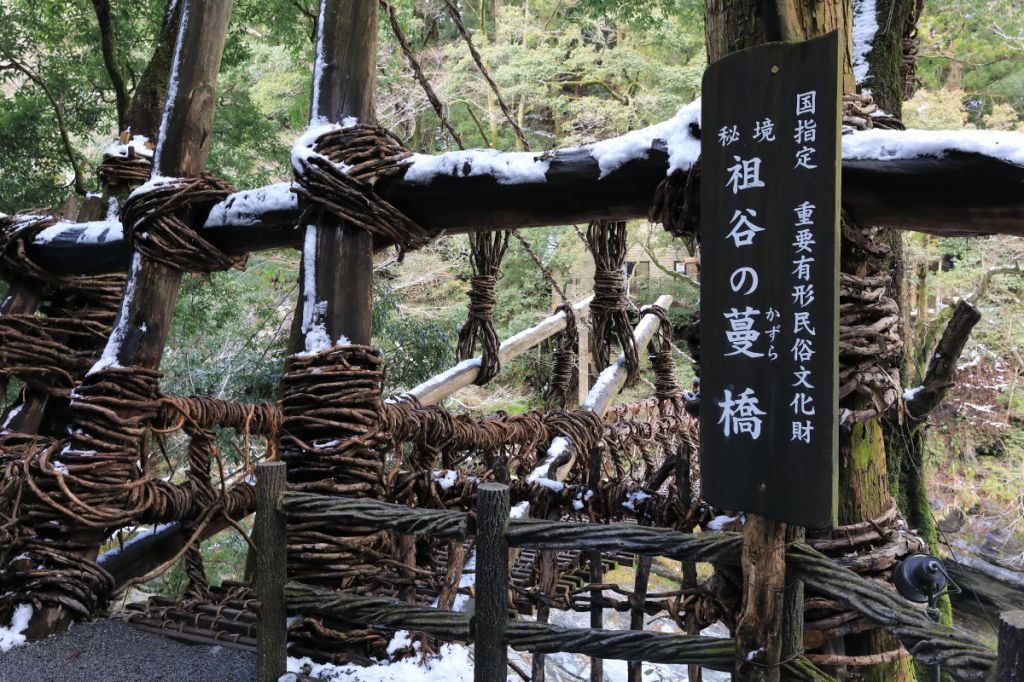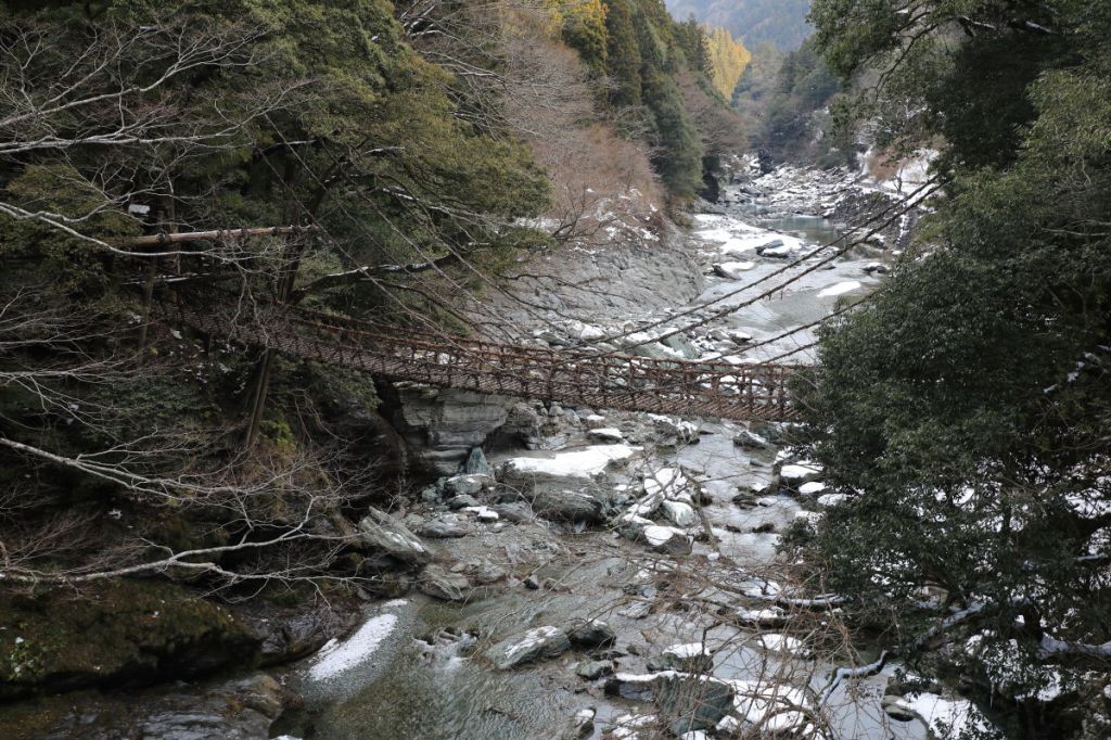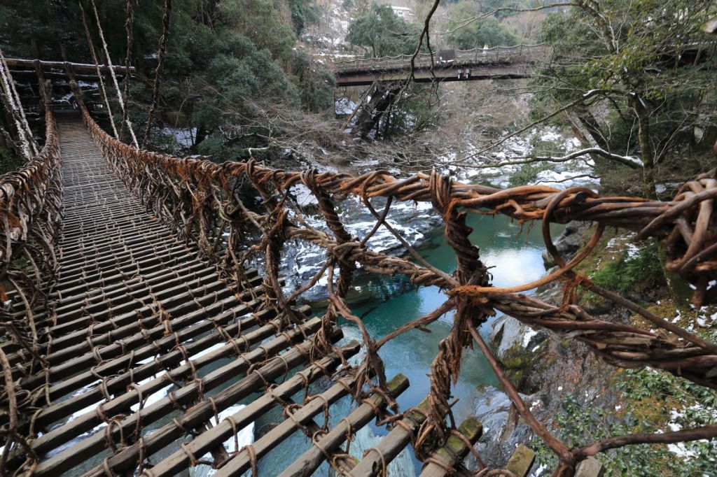 今日は朝から祖谷渓谷にあるかずら橋に行きます。かずら橋はサルナシなどの葛類を使ってかけられた橋で、長さ45m、幅2m、谷からの高さ14mで日本三大奇橋の一つで、重要有形民俗文化財となっています。現在の橋は安全のためワイヤーを葛で装飾しているらしく見た目よりは安全に作られているそうです。