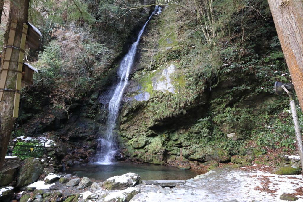 ようやく出口側に到着、少し歩くと琵琶の滝があります。源平合戦の屋島の戦いに敗れた平国盛が安徳天皇を奉じて祖谷の入り土着したという平家の落人伝説の一つとなっていますが、その落人達が都での生活をしのびながらこの滝の下で琵琶を弾いたことから琵琶滝といわれているそうです。