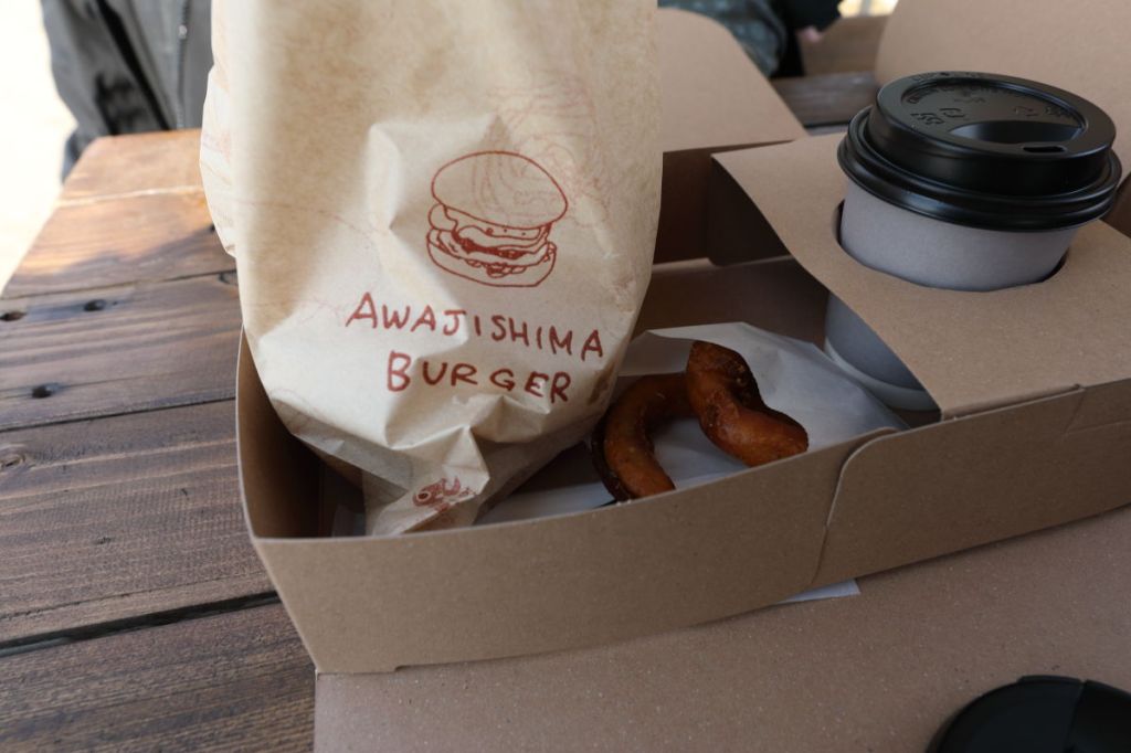 ここで全国ご当地バーガーグランプリで1位を獲得した「あわじ島オニオンビーフバーガー」、オニオンリングフライと飲み物のセットを購入してテラスで昼食としました。