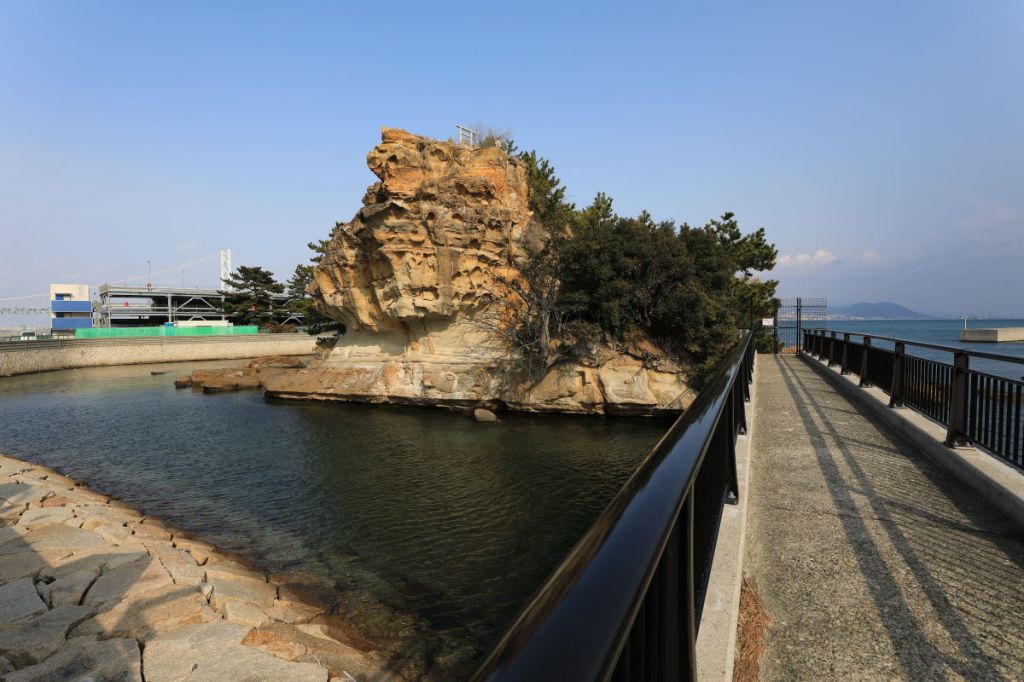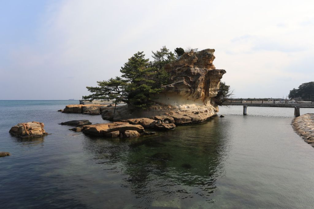 次に向かったのは淡路島の北端にあるこの寺から近い絵島に行きました。絵島は2千万年前の砂岩層が露出した岩で長年の風雨や波で岩肌が不思議な絵模様になっています。自然のアート作品として淡路島のシンボルとなっている島です。日本神話の一つである国産み神話にはイザナキ・イザナミの二神があまのうきはしに立ちあめのぬぼこで作った日本列島最初のおのころ島がこの絵島であると伝承されています。古くからの景勝地で多くの和歌にも詠まれています。