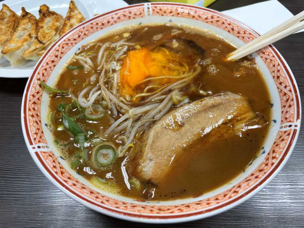 スープはマイルドな豚骨と醤油の入った徳島ラーメンの茶系のスープで麺は中太ストレートです。テーブルには無料の生卵が置かれていて地元の人はみんなラーメンに入れていたのでそのようにしました。もやしやネギに厚切りチャーシューが2枚入っていてボリューム感のあるラーメンです。