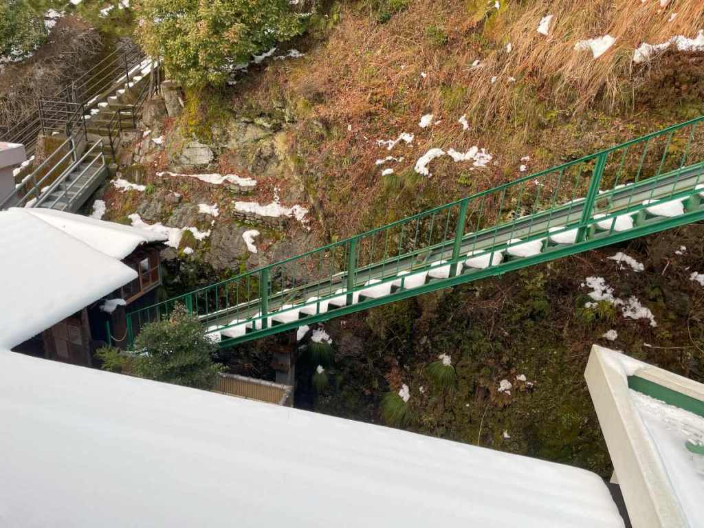 泊まった部屋の窓から先ほど乗ったケーブルカーが見えました。左の小さな小屋のようなものがケーブルカーです。昨日までの雪ですっかり雪化粧をしています。