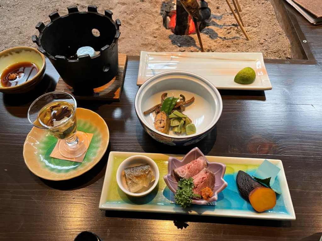 上の空の皿には囲炉裏の炭火で焼いた祖谷の伝統料理の「でこまわし(じゃがいも、豆腐、こんにゃくの串焼き)」と鮎の塩焼きがのせられました。