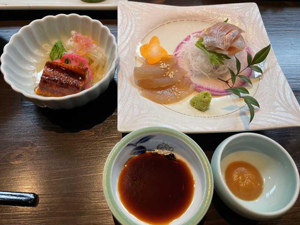 渓流のあめご(この地方ではアマゴではなくあめごと呼ぶそうです)のお造りとこんにゃくの刺身、鰻の酢の物が出てきました。あめごはあっさりとしてうまみがあり歯ごたえが良くとても美味しかったです。