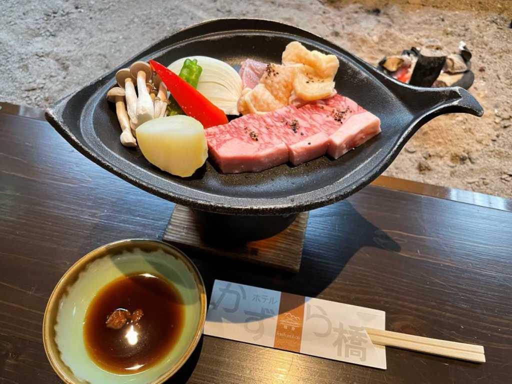 徳島のブランド牛である和一と阿波尾鶏、季節野菜の陶板焼きは絶品でした。