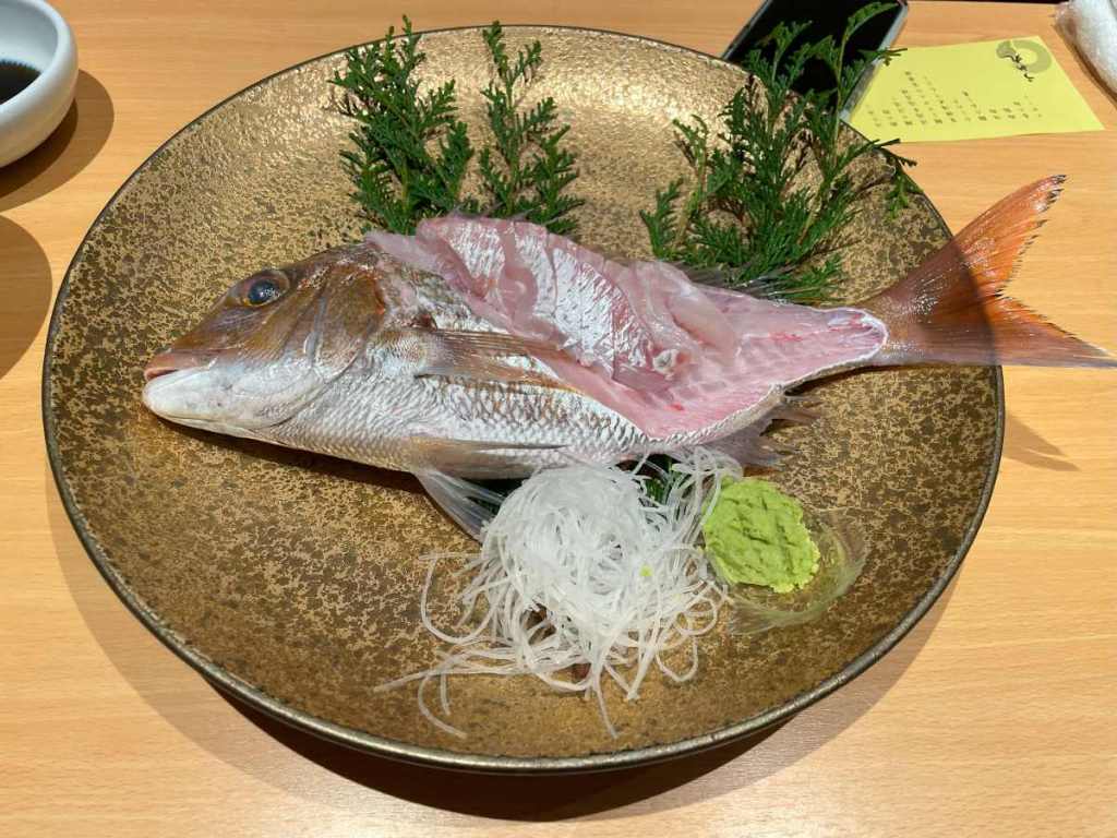 夕食は鯛活き造りフルコースと淡路牛です。付き出しと酢の物が出た後に、まずは鯛の活き造りが出ました。歯ごたえが素晴らしく新鮮さを感じます。