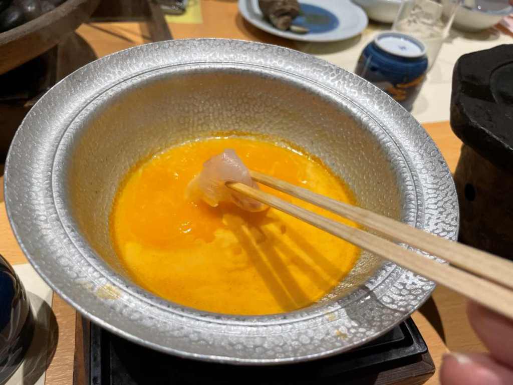 有頭海老の天ぷらが出た後に今度は鯛の薄造りをウニの入っただし汁でしゃぶしゃぶ。