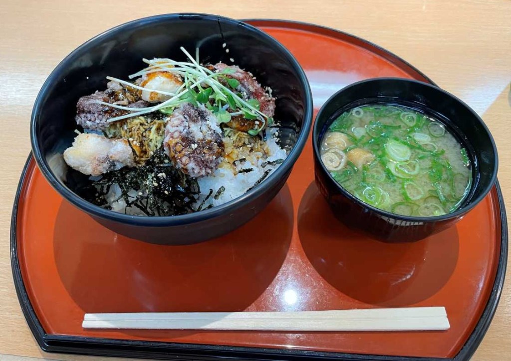 昼食はあなご丼のお店に行く予定でしたが、すでに売り切れだったので、やむなくあわじしま南パーキングのフードコートでタコのから揚げ丼を注文しました。2つの海峡に挟まれた淡路島は海鮮が美味しくこのタコも絶品です。