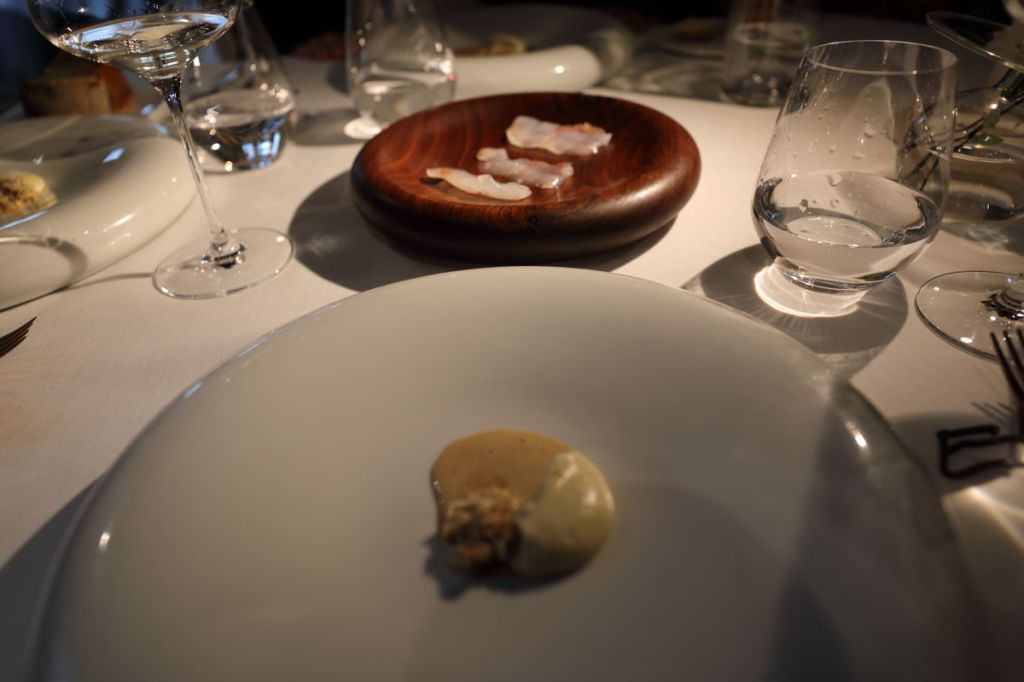 3皿目はバスク地方の名物であるメルルーサの顎の肉部分を使った”KOKOTXAS”異なる3つの味付けで調理したものです。グリル、バター、緑のソースでどれもいい味を出していました。