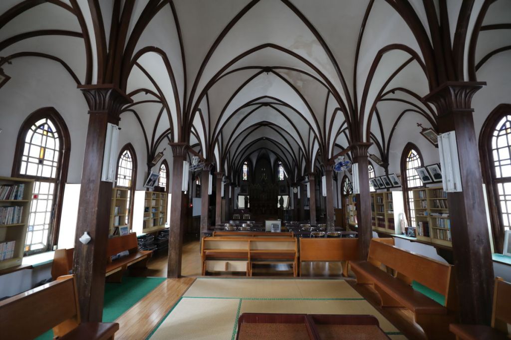 The former Tainoura Church was built in 1903, and the current church was expanded with a bell tower made from bricks from the former Urakami Cathedral, which was destroyed by the atomic bomb in 1948. It is currently used as a reference room and a Sunday school.