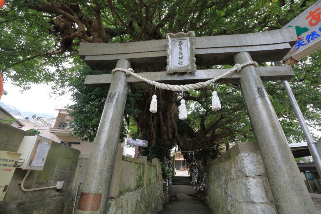 Since I still had time, I went to see the Akou tree (Ficus superba) at Narao Shrine near Narao Port. It is estimated to be 670 years old and is the largest tree in Japan. It splits into two at the bottom, forming a natural torii gate. It is said that walking through it will extend your life.