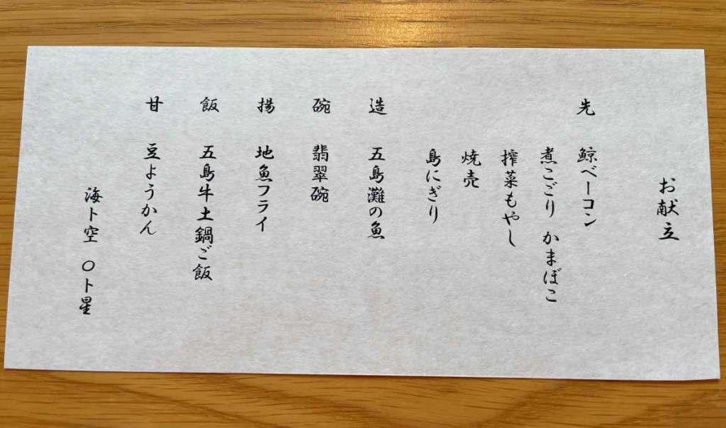 First, I ordered sweet potato shochu made by a sake brewery in Shinkamigoto. The sweet potatoes and rice malt were all made in the Goto Islands, and it was a very good shochu with a rich flavor.