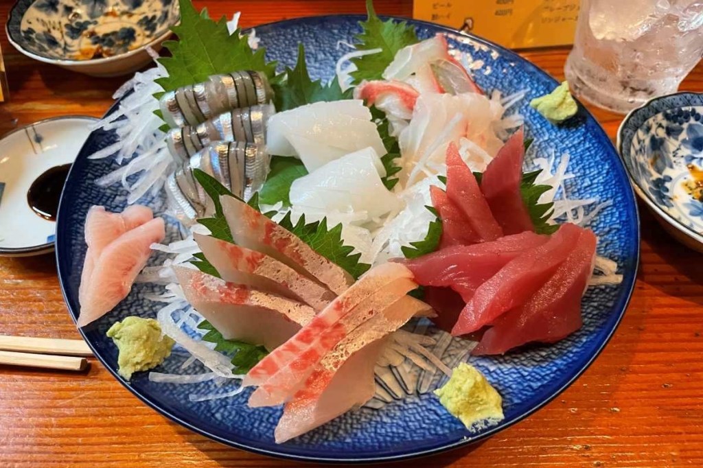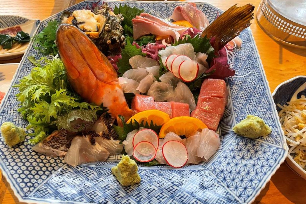 The sashimi platter features fish from the Goto Islands, including silver-striped round herring, bigfin reef squid, cherry snapper, yellowtail amberjack, and tuna.