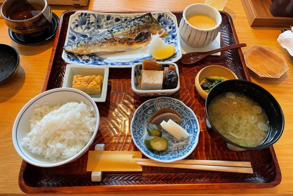 Today, after breakfast, I took a sightseeing taxi to tour Nakadori Island, where Shinkamigoto Town is located. The hotel breakfast was a Japanese set menu, but the salt-grilled mackerel was fatty and had a taste I had never tasted before. There was also a wide variety of side dishes to go with the rice, such as raw eggs, horse mackerel namero, grated yam, and kelp tsukudani.