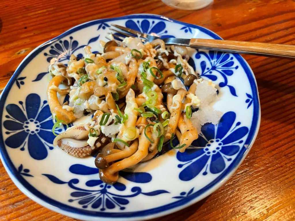 The stir-fried spear squid tentacles and shimeji mushrooms in olive oil were dressed with mayonnaise, giving the dish a sweet taste of squid.