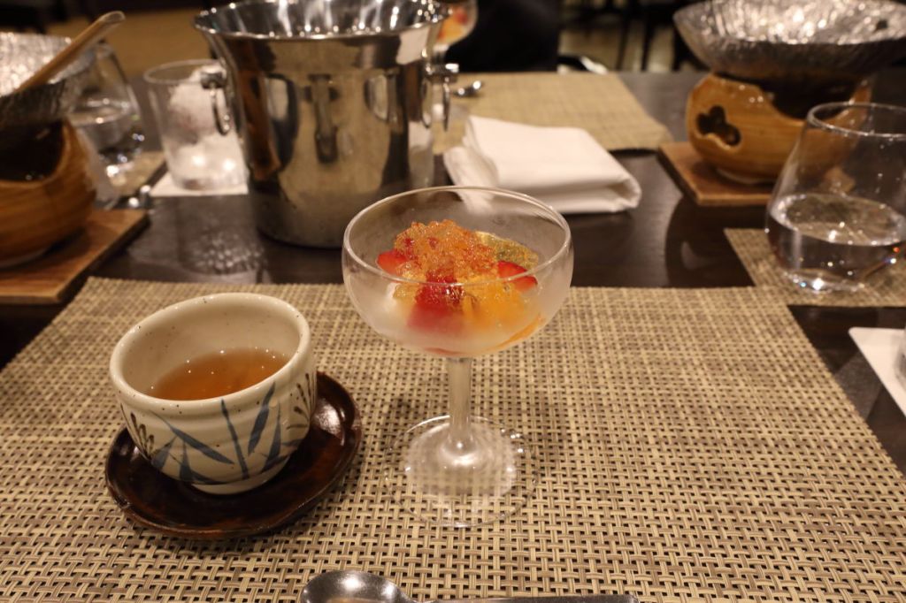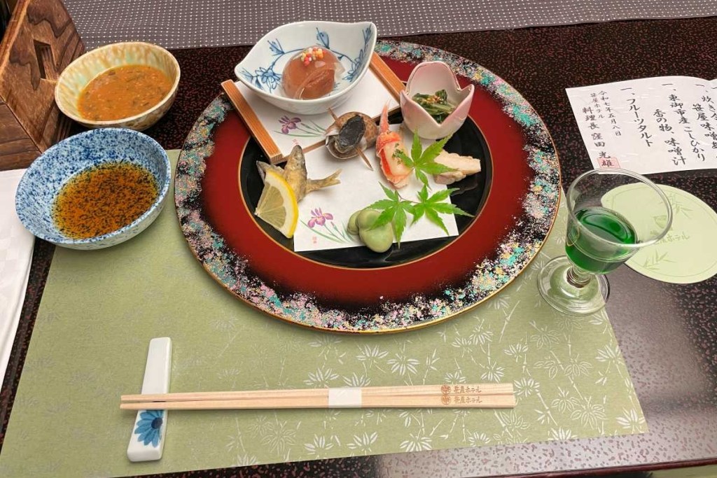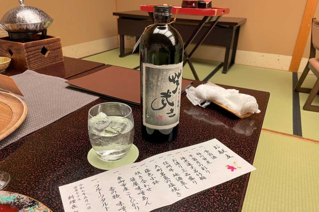 The meal was a Japanese kaiseki dinner, accompanied by sweet potato shochu from Nagano Prefecture.