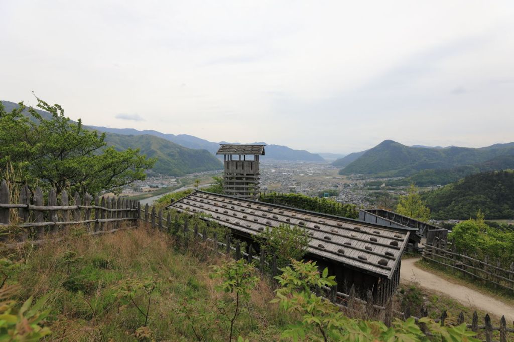 The castle is a type of mountain castle made up of multiple enclosures, which was a common style at the time, but it was a very simple structure. Beyond the turret, you can see the city of Ueda.