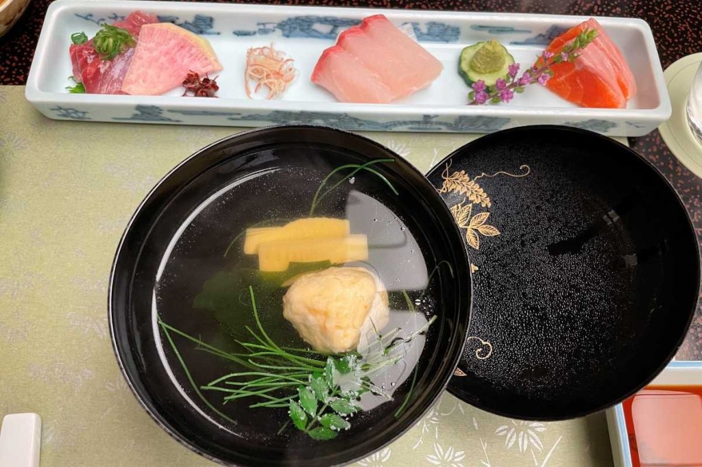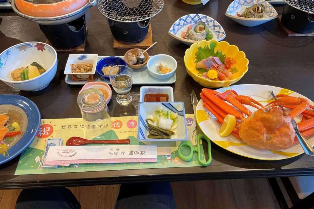 Dinner consists of a kaiseki meal featuring a whole red snow crab and a sashimi platter making quite. However, the drawback lies in the need to to extract the crab meat, which can be somewhat inconvenient.