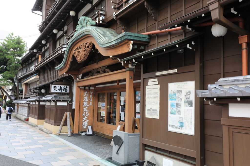 伊東市街に近い駐車場に車を止めて、伊東市指定有形文化財の東海館を見に行きました。東海館は1928年に庶民の温泉宿として開業しましたが、建物には檜や杉の高級木材が使用された純和風建築です。