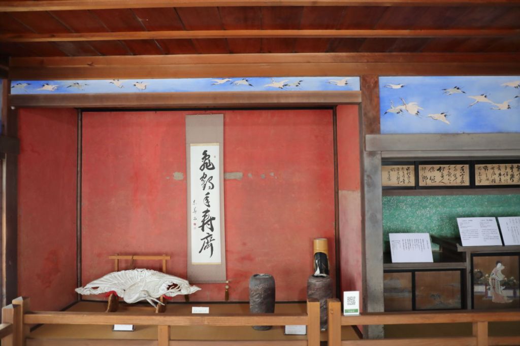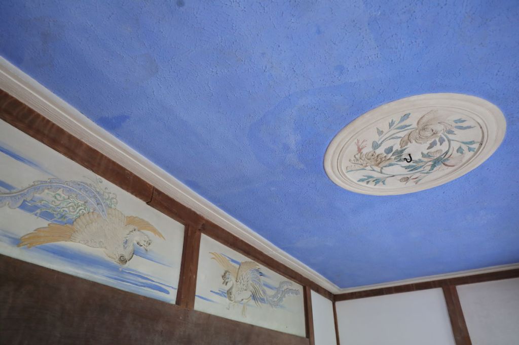 2階客室の西の間は純和風の部屋で名工入江長七によって千羽鶴が施されています。一羽一羽異なった姿で色彩も見事な組み合わせです。