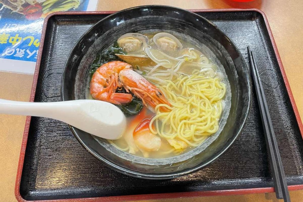 2階のらぁめん・じゃんまりんという店で、海の幸ラーメンを注文、サザエご飯の小丼もと思いましたが売り切れとのことでした。海鮮が多く入っていてあっさり塩味でまずまずの味でした。