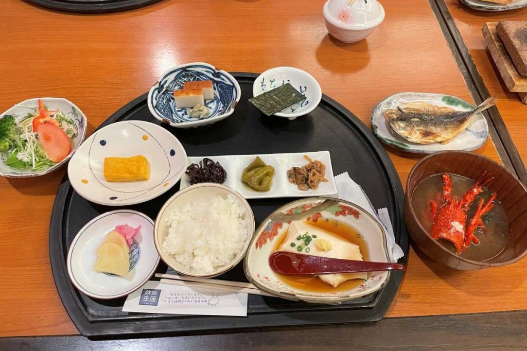 朝食時に昨日刺身で提供された伊勢海老の頭付きの味噌汁が出ていました。