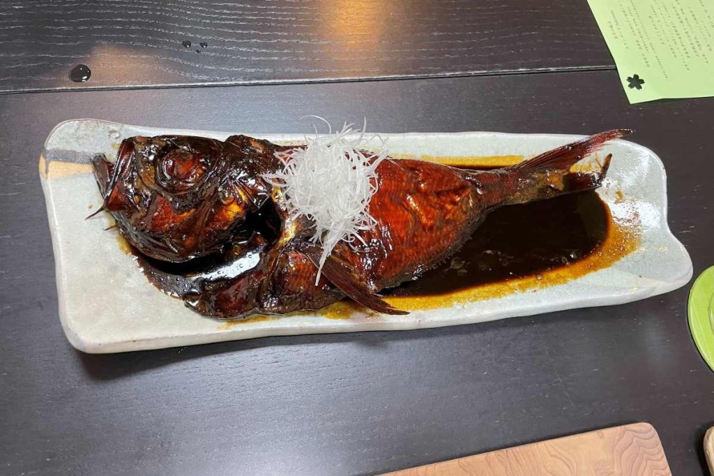 ここの自慢の料理は代々継ぎ足した秘伝のたれで煮込んだ金目鯛の姿煮です。見た目は色が濃く味が濃いように見えますが、品のある薄味に仕上がっています。