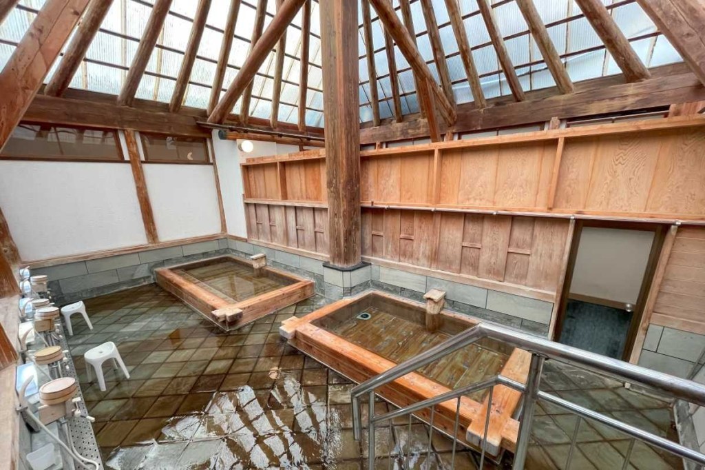 今日は2組で男性は私だけなので内湯の男湯の写真を撮らせてもらいました。手前の檜の湯舟は少し熱めで奥はぬるめに調整されていて、源泉は足元から流れています。泉質はナトリウム・カルシウム硫酸塩で、肌に優しく肌の保湿や鎮静作用など様々な健康効果があります。また飲用もでき消化器系などに効果があるようです。