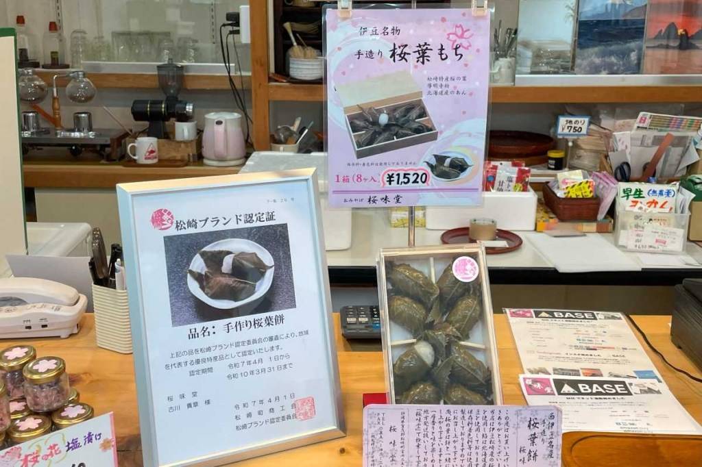 次に松崎町を訪れた時の定番のお土産を買いに、まずは桜味堂で桜葉もちを購入しました。餡の入った餅を塩漬けの桜の葉で巻いたもので桜の葉の香りと塩気が餡の甘さによく合っています。