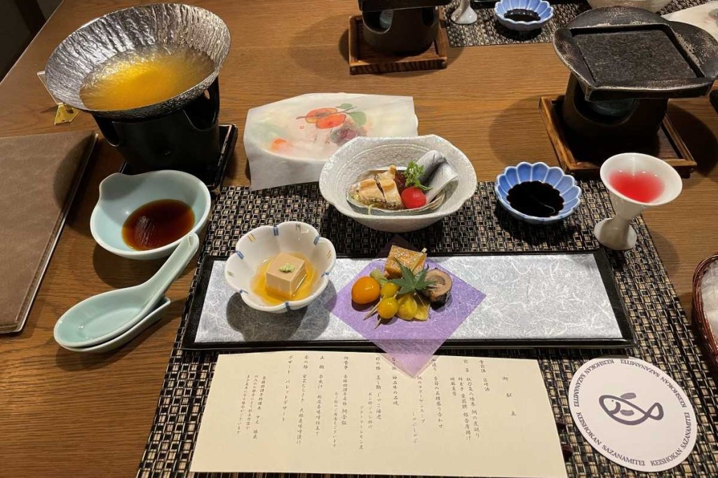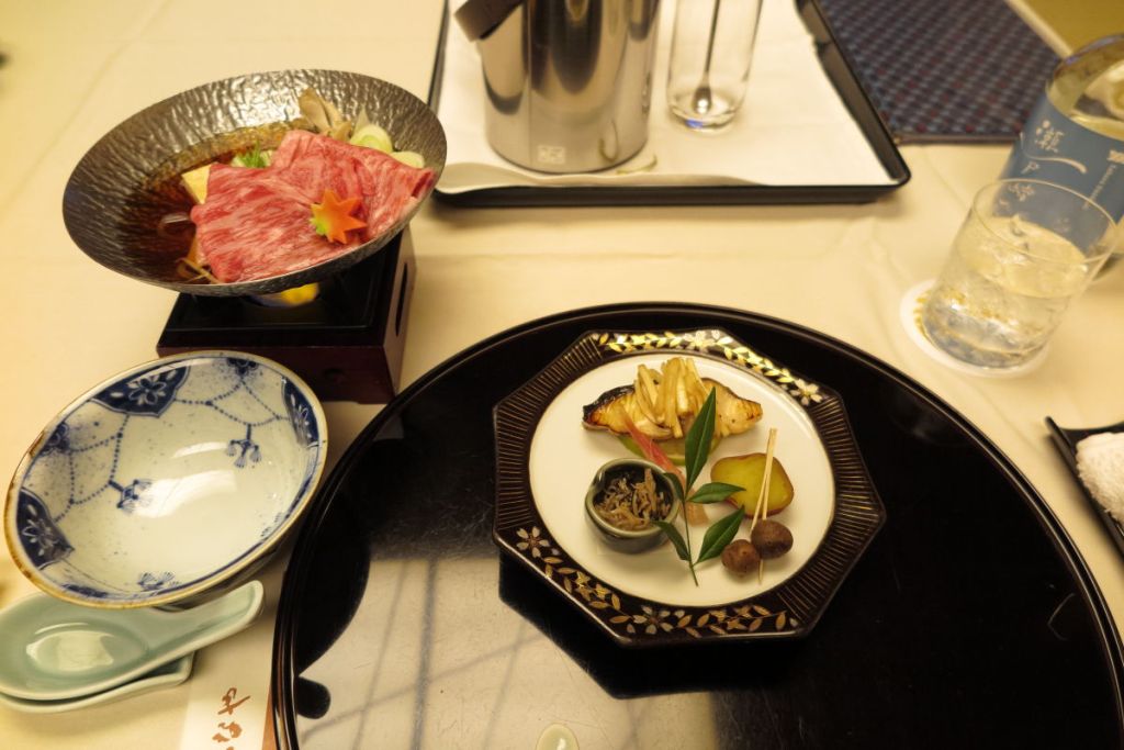 夕食は部屋での会席料理です。旅館での部屋食はしばらくぶりです。中居さんが手際よく料理を運んでくれました。まずは前菜3品で、左のカップ雪花菜(きらず)というお客様との縁を切らずという意味を込めたふなや先代からの料理でした。中央は胡桃豆腐、右は秋刀魚有馬煮、合鴨紅葉煮、白身魚のすり身にチーズと栗を合わせた蒸し物です。どれも丁寧な仕上げられ満足できる料理です。