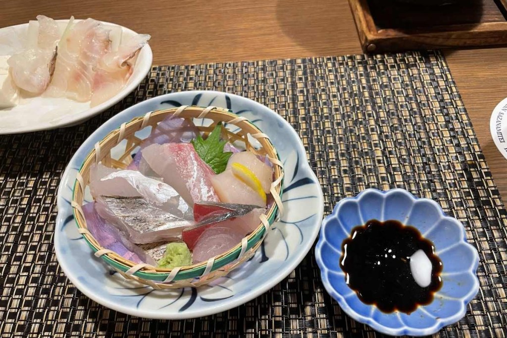お造りは、左手前から時計回りに、太刀魚、コチ、真鯛、平貝、シマアジの五種類でした。
