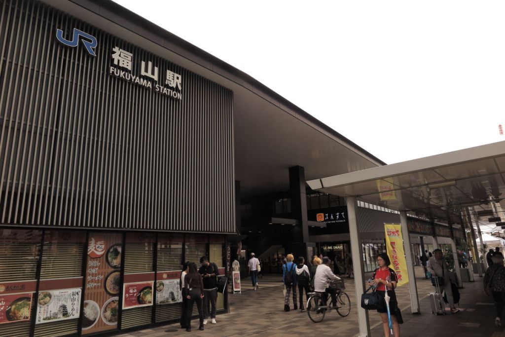 羽田空港09:55発のJAL257便に搭乗し、広島空港に11:20に到着しました。空港で軽い昼食をとった後に12:25発の福山駅行のリムジンバスに乗車し、福山駅に13:30に着きました。旅館の14:45発の無料シャトルバスを予約していたので、それまでの間駅周辺を散策しました。駅周辺にはコスプレをした若者が多数いて驚きましたが、当日はフクヤマアニメのアニメをテーマにしたイベントが開催されたいたようです。