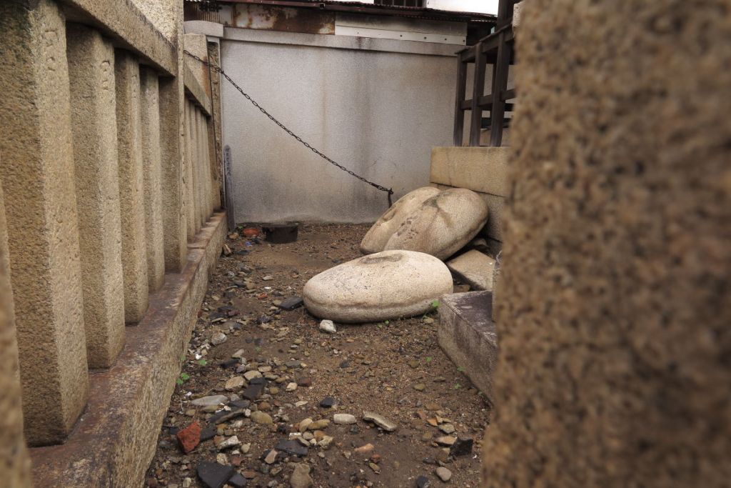 少し歩くと住吉神社の祠の奥に、鞆の津の力石が3つ置いてありました。花崗岩製の楕円の石で230㎏から118㎏あるそうで奉納者と重さが刻まれているそうです。