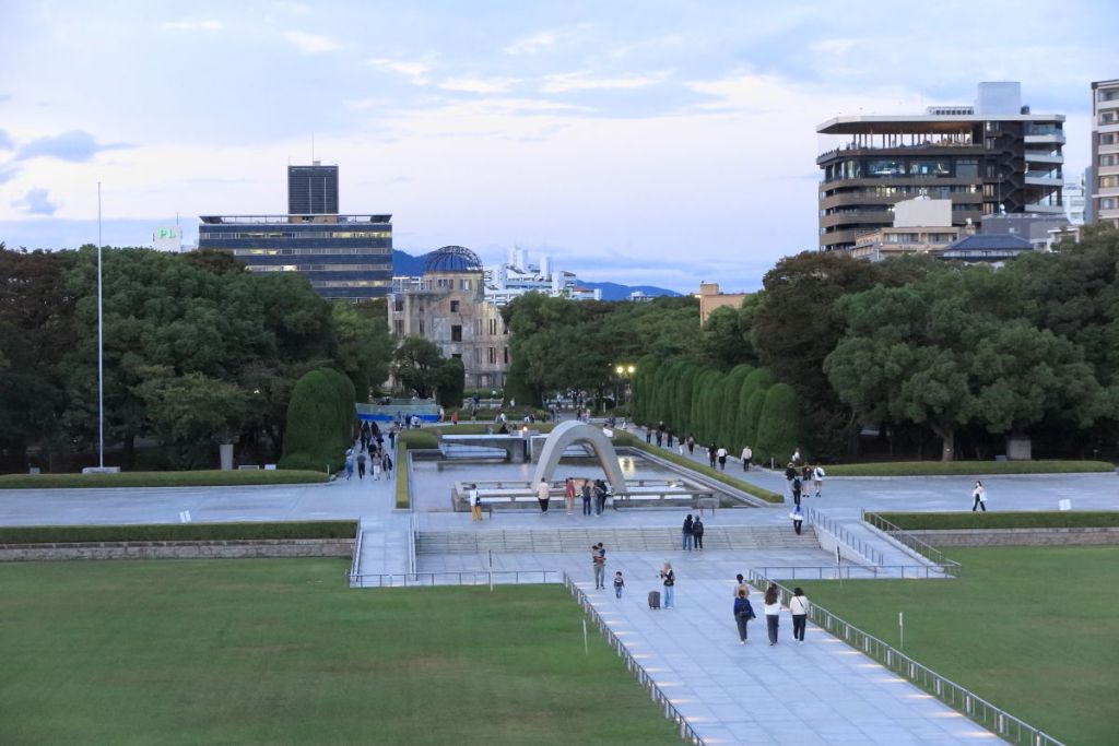 平和記念公園の奥に爆心地であった原爆ドームが見えます。