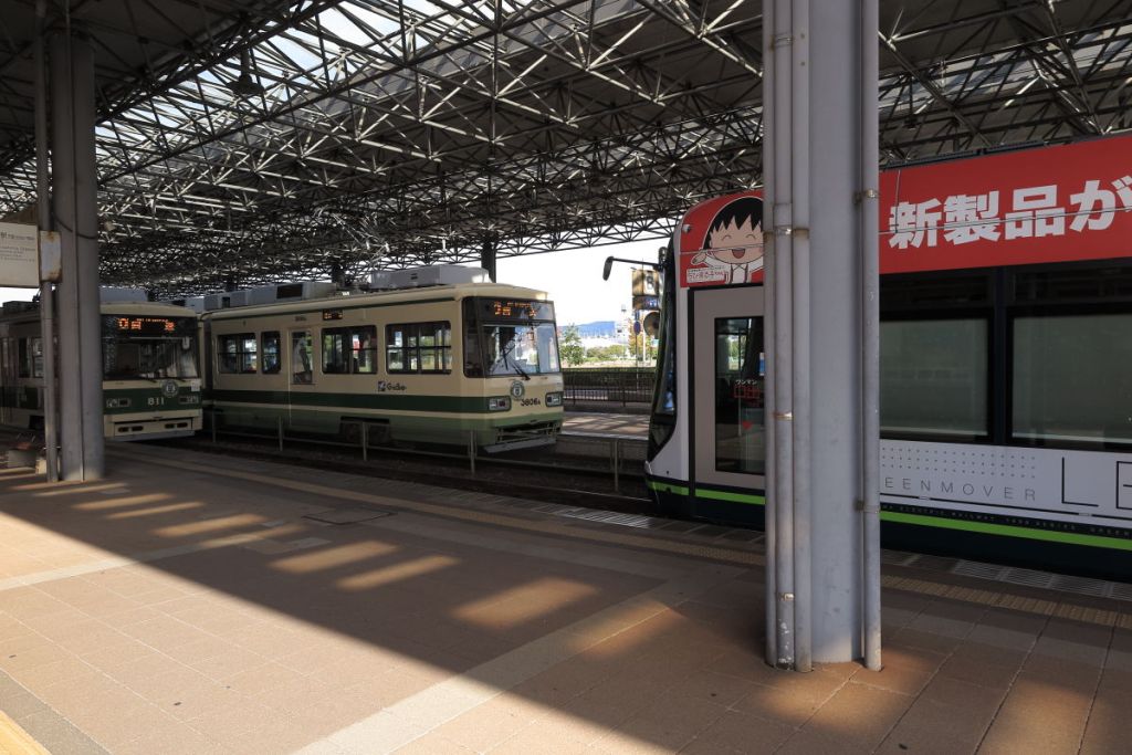 今日は道後温泉に向かいます。ホテル近くの中電前から広島港まで路面電車に乗りました。終点の広島港には新旧の電車が停車していました。