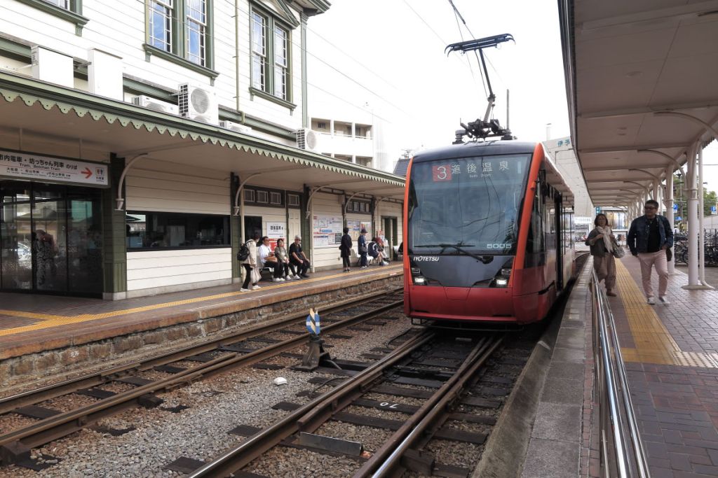 松山市駅から路面電車で道後温泉駅に到着。古い車両が走っているイメージがあったのでこの新型車両にも驚きました。